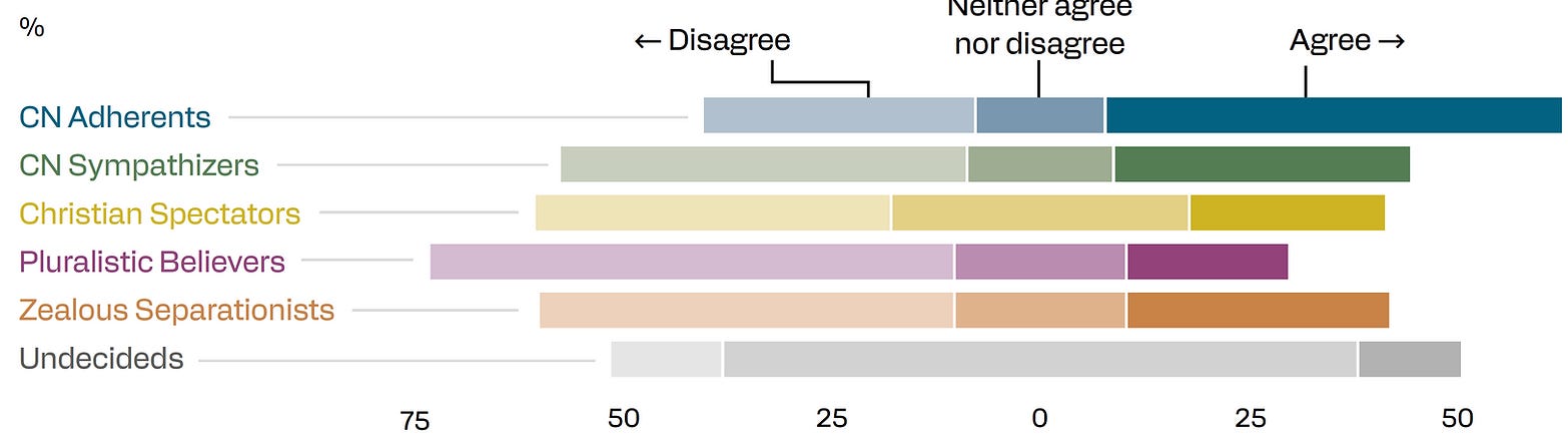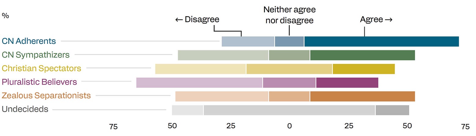 Additionally, 37% of CN Adherents support "having a strong leader who does not have to bother with Congress and elections," and 49% want "America's Judeo-Christian founding explicitly established in the Constitution."