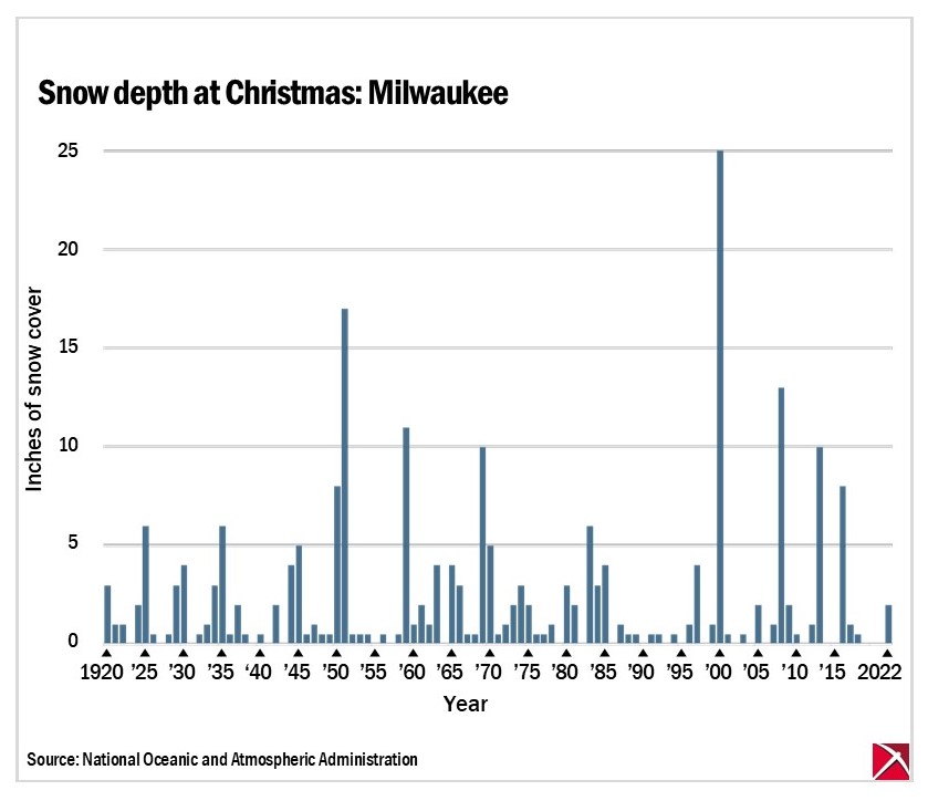 But even in Milwaukee, in any given year, there’s a good chance of at least some snow accumulation, and the average Milwaukee snow cover at Christmas is greater in recent years than during some other long stretches in the past century, according to records from the National Oceanic and Atmospheric Administration, the agency that includes the National Weather Service. |