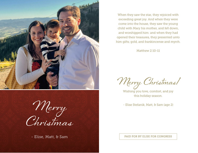 | This is a time to gather with friends and family to reflect on our many blessings. It is also a time to look beyond ourselves and give back to our communities. As we gather with friends and family to reflect on our many blessings this Christmas, I hope you’ll join me in thanking the incredible people who make up the fabric of our community. | | This holiday season, my thoughts and prayers are with the brave men and women who serve our country to keep us safe, especially those who may be spending their Christmas away from their families. I am thankful for our Fort Drum and 10th Mountain Division Servicemembers, our veterans across Upstate New York and the North Country, and our military families. Thank you for your service and sacrifice. | | To our farmers and small businesses who are the engine of our local economy, thank you for your hard work! | | While we all have so much to be thankful for this Christmas, I am incredibly grateful for the honor of serving you in Congress, working to bring the concerns of Upstate New York and the North Country to the highest levels. | From my family to yours, Merry Christmas and Happy New Year! | | Paid for by Team Elise, a joint fundraising committee authorized by and composed of Elise for Congress and E-PAC. www.elisestefanik.com | | PO Box 500 Glens Falls, NY 12801 | | This email was sent to: [email protected]. Please do not reply to this email as this address is not monitored. We believe that email is a vital way to stay in direct contact with supporters, but you can click here if you would like to unsubscribe from these messages. | |