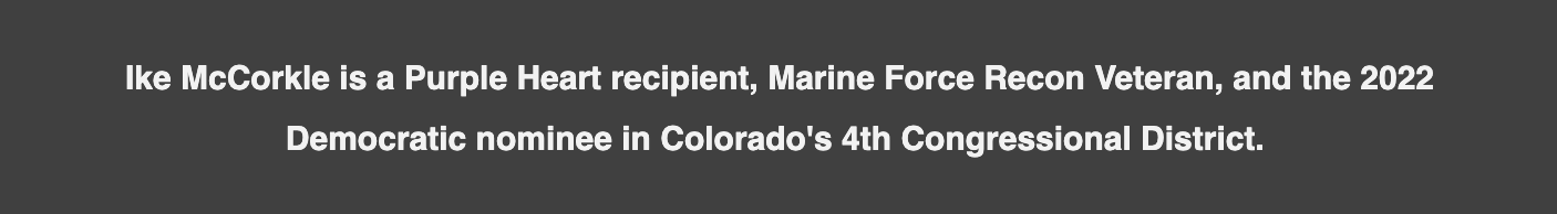 My name is Ike McCorkle and I am the retired Marine Corps Force Recon Officer, Purple Heart recipient, and Democrat running in Colorado’s 4th Congressional district for the past two cycles.