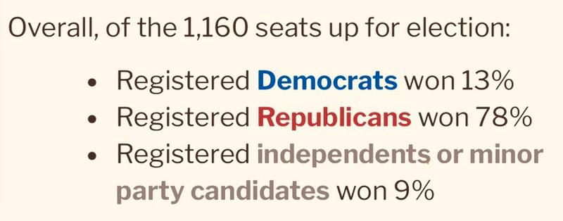 Republicans won big across the state taking 78% of all seats up for election. Yes, you read that right. 78%.