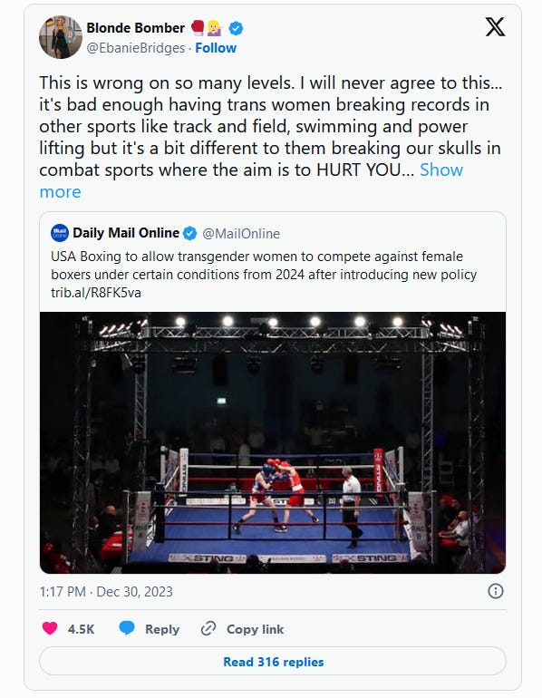 USA Boxing, the national authority overseeing the sport and its Olympic representation, has introduced a transgender policy into its rulebook permitting biological males to compete in women's categories. To be eligible, fighters must meet specific criteria. They must formally declare their gender identity as female, be 18 years or older, maintain testosterone levels below a specified threshold, and undergo "gender reassignment surgery." The definition of "gender reassignment surgery" remains unclear, noting that a significant portion of transgender individuals may not undergo such procedures. USA Boxing justified the policy in a statement, asserting that its purpose is to ensure fairness and safety for all participants. The move has triggered substantial opposition from various fighters and boxing commentators. True Geordie, a U.K.-based analyst, expressed concern about the inherent unfairness posed to female fighters. While acknowledging a willingness to use preferred pronouns for transgender individuals, Geordie emphasized the potential safety risks and unfair advantages that could arise, asserting that the issue is not about discrimination but rather fairness. Ebanie Bridges, a prominent boxing star, also condemned the decision, deeming it "wrong on so many levels." She voiced her disagreement, particularly citing concerns about trans women breaking records in sports like track and field, swimming, and powerlifting. Bridges underscored the distinct challenges in combat sports where the objective is to inflict harm, expressing her opposition to the policy across all sports. In a social media post, Bridges emphasized her strong stance against the decision, highlighting the potential dangers in combat sports and the broader implications for fairness in all sporting arenas Please Subscribe To Read The Next Article… Keep reading with a 7-day free trialSubscribe to PatriotNewsToday to keep reading this post and get 7 days of free access to the full post archives. A subscription gets you: