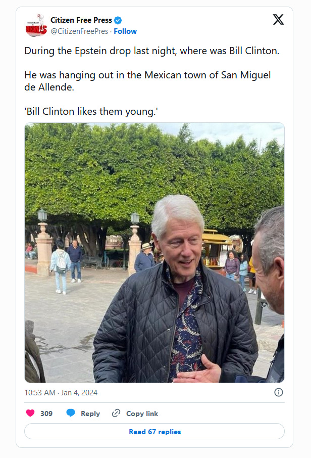 Former President Bill Clinton has been spotted in a small town in Mexico – San Miguel de Allende, Guanajuato – shortly after the release of the Epstein files. He was observed walking through the main square of the town, a popular tourist destination. The Mayor of San Miguel de Allende, Mauricio Trejo Pureco, shared a photo of Clinton on social media, where he is seen in front of the parish of San Miguel Arcángel. The Mayor welcomed Clinton to the town. The sighting coincides with the release of court documents related to Jeffrey Epstein, which mentioned Clinton extensively alongside more than 150 other people reportedly associated with the infamous Epstein. The documents stem from a civil lawsuit filed against British socialite Ghislaine Maxwell. The claim that Clinton ‘likes them young’ was mentioned in the testimony of Johanna Sjoberg. She alleged that she was hired by Maxwell and abused by Epstein, testified that Epstein made a remark stating “Clinton likes them young,” referring to girls. JUST IN: Trump’s Legal Team Makes Big Move Keep reading with a 7-day free trialSubscribe to PatriotNewsToday to keep reading this post and get 7 days of free access to the full post archives. A subscription gets you: