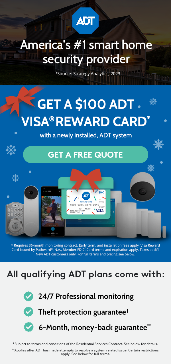 *$100 ADT Visa Reward Card: Requires 36-month monitoring contract starting at $28.99/mo. (24-month monitoring contract in California, total fees from 695.76), and enrollment in ADT EasyPay. Requires minimum purchase price of $449. One (1) Visa Reward Card valued at $100 is redeemable seven (7) days after system is installed, wherein an email is sent to the customer's email address associated with their account with a promo code. The customer must validate the promo code on the website provided in the email and a physical card will be sent in the mail. Installation must occur within 60 days of offer expiration date to receive card. Applicable to new and resale sale types only. Card is issued by Pathward, N.A., Member FDIC, pursuant to a license from Visa U.S.A. Inc. No cash access or recurring payments. Can be used everywhere Visa debit cards are accepted. Card valid for up to 6 months; unused funds will forfeit after the valid thru date. Card terms and conditions apply. Google, Nest Cam and Nest Doorbell are trademarks of Google LLC. Google Nest products and services featured are designed to make life easier and to build a helpful home and were not designed specifically for life-sustaining or safety-critical use cases. These products and services depend upon working internet, Wi-Fi, and, in some cases, the service availability from ADT and/or Google. To learn more, please visit g.co/nest/TOS.