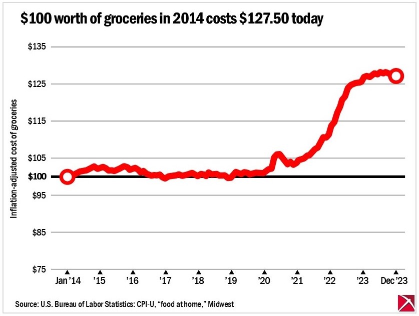Have you noticed your grocery bill increasing? According to the U.S. Bureau of Labor Statistics, the federal agency that tracks inflation data, the cost of groceries in the Midwest has been on the rise since 2020 after years of holding even. A basket of groceries that would have cost $100 in January 2014 would now cost $127, according to the BLS’ consumer price index for “food at home” in the Midwest. |