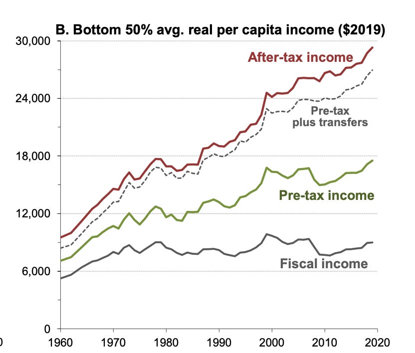 Source: Figure B from Gerald Auten and David Splinter, Income Inequality In the United StatesAmericans and their elected representatives have long engaged in an enduring debate over income inequality and what the government should do about it. Over recent decades, they have turned their attention to the growth of income inequality, with the left decrying its deterioration and the right proclaiming that the inequality of total income and the consumption of households have not increased much, if at all. The intensity of this debate belies its weakness as a way to resolve the tax and spending roles of government. The policy debate should focus on what the government should do to take advantage of opportunities, meet needs, and distribute the burdens of government fairly and efficiently. That’s true regardless of whether income inequality has grown. Much confusion derives from sources of income unseen in many accounts, the problematic measurement of which sparks further debate. Market income and the type of income reported on tax returns understate the total income of poor, middle-class, and wealthy alike, though in different ways. When I reported that the average U.S. gross domestic income and product recently exceeded $200,000 per household, many were incredulous, as much of that income never shows up formally in their wages or bank accounts. Drs. Gerald Auten and David Splinter recently re-engaged the debate over rising income inequality with one of the most comprehensive efforts to allocate all national income across different income classes. (Full disclosure: I provided some review of this research.) The graph above, from their paper, summarizes their measure of average income growth for all households with median or lower income. The bottom line shows how the average fiscal income of Americans (essentially the income reported on tax returns) in the bottom half of the income distribution has grown little since the mid-1970s. The higher lines next show how total income for these households has grown more substantially when one counts changes in employee benefits, taxes, transfers, and other unreported income. In their paper, Auten and Splinter also suggest that the top 1 percent of the income distribution has gained, at best, only modestly larger shares of total income. In its lead opinion on January 7, 2024, the editorial staff at the Washington Post suggested that the Auten-Splinter research “has been received as a radical recasting of U.S. inequality." They also noted a substantial backlash and quoted Thomas Piketty, who said that “inequality denial” was like “climate denial." Auten and Splinter engage in no denial: they fully recognize income inequality and merely question the extent of its growth. Thomas Piketty, Emmanuel Saez, and Gabriel Zucman produced some of the best-known studies on income inequality. But many other comprehensive studies, such as that by the Congressional Budget Office, and analyses, such as by Steven Rose, on productivity and middle-class income growth, use different vantage points and question simplistic conclusions. Despite the intensity of the debate among researchers, their studies show many similar long-term trends and come to many similar conclusions. Wages and other market income have become much more unequal. Net government transfers, including Social Security, Medicare, and other healthcare supports (regardless of whether they appear on tax returns), have increased substantially—in fact, faster than economic growth. However, what is usually missed in the debate is that those losing out in the market are often not the same as those gaining from the net transfers. In particular, those transfers have only modestly helped working-class households achieve total income growth at the same rate as average households. Even if the same people did get transfers that offset their market incomes, It is hard to believe that a continually rising wage and market income inequality is good for people, economic growth, and political cooperation. Among other reasons, the growth in inequality of market income—what people derive from their efforts to work and save—goes hand-in-hand with less upward mobility across generations for those born into poorer families. It also reflects increased inequality of the human capital and skills needed to thrive in a market economy. A bit more detail. Almost all the growth in government transfers has come from Social Security and health care. That does a lot to increase the income—counting health care—of older, retired adults, but not the cash income and less so the total income of the working class. Meanwhile, employee benefits have also grown substantially, further dampening the cash wage growth of workers. The unseen nature of many sources of income and the confused debate over the extent of inequality can dramatically affect government decision-making and the public’s perception of fairness. Here are only two examples: Official and supplemental measures of the size of the poor population count cash benefits and sometimes child credits, but not health benefits, as income. Taxing the wealthy through individual income tax rates has limited effect as long as much of their income is derived from accrued, unmeasured, and untaxed capital gains. Those distinctions often distort our sense of the efficacy of transfers to the poor and taxes on the rich alike. Pick the wrong measure, therefore, and you may misrepresent what has happened to the poor, the working class, and the wealthy—and what can be done about it. In sum, despite the disagreement among researchers, they have improved our understanding of the distribution of the economy's income from all sources. That should allow us to move beyond the headline political debate to make more informed decisions about government policy. Please recommend the column to others. Less importantly, if you’re a free subscriber, you can upgrade to paid. |