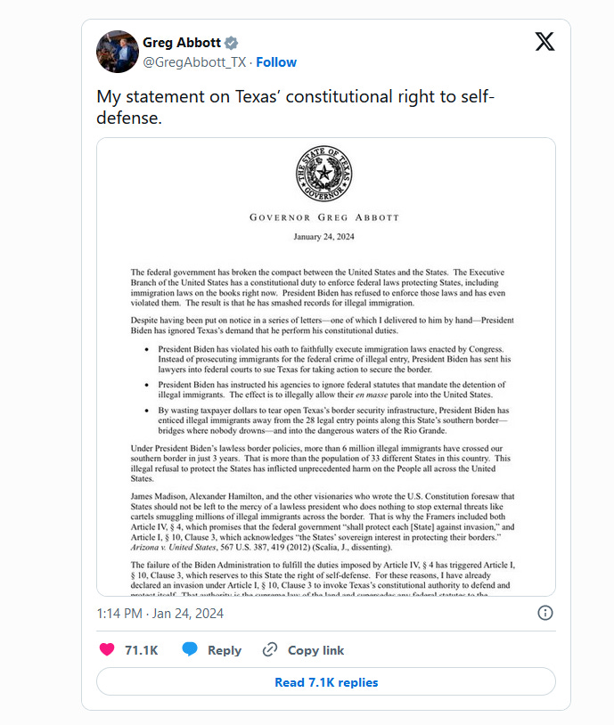 Earlier in the week, Rep. Clay Higgins (R-TX) urged Texas to "stand their ground." However, critics interpreted these developments as potentially inciting civil conflict. The razor wire installation is a crucial component of Governor Abbott's Operation Lone Star, aimed at curbing illegal immigration. The operation also involves busing migrants to Democratic-led cities and arresting migrants on trespassing charges. The Biden administration opposes these measures, arguing that they impede federal agents and violate federal laws. The Supreme Court's narrow 5-4 decision against the wire installation underscores the complex dynamics of federal-state relations. In contrast to Biden's approach of reversing strict immigration policies of the previous administration, Abbott has launched state-level initiatives, including deploying state law enforcement and continuing the construction of a border wall in Texas. The escalating tensions have led to several legal confrontations between Texas and the Biden administration. Governor Abbott consistently criticizes the federal government for neglecting border security and exacerbating a humanitarian crisis. Meanwhile, Biden and his officials condemn Texas' unilateral actions, suggesting they undermine federal immigration policy. "We are using every tool that can be used, from building a border wall to constructing these border barriers to passing this law that I signed, leading to another lawsuit by the Biden administration where I signed a law making it illegal for somebody to enter Texas from another country," Abbott stated in early January. "And so– and they're subject to arrest and subject to deportation. So, we are deploying every tool and strategy that we possibly can. The only thing that we're not doing is we're not shooting people who come across the border because, of course, the Biden administration would charge us with murder.” Keep reading with a 7-day free trialSubscribe to PatriotNewsToday to keep reading this post and get 7 days of free access to the full post archives. A subscription gets you: