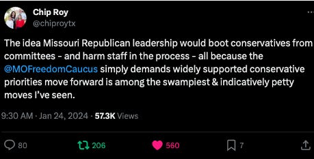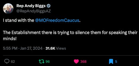 Missouri RINOs Retaliate Against MO Freedom CaucusMOFC receives air support from the national House Freedom Caucus...and wins!Friends, It has been less than a month since we helped launch our latest Freedom Caucus in the great state of Missouri and they’ve already upset the Swamp in Jefferson City so much that their RINO leaders retaliated against them. Last week, the Missouri Freedom Caucus (MOFC) attempted to pressure the legislature to finally pass Initiative Petition (IP) reform, in order to stop left-wing dark money from being able to influence ballot measures in Missouri. This is an issue that the entire Republican apparatus in the state - including the RINOs - have professed is incredibly important. The RINO leadership in the MO Senate was holding IP reform up, so the MOFC responded by blocking Gov. Mike Parson’s administration appointments until it was brought up for a vote. In response, not only did the RINOs that run the Missouri legislature refuse to bring up IP reform, a key campaign promise from the state’s Republicans, but the RINO Senate Pro Tempore Caleb Rowden removed State Senators and MOFC members Rick Brattin, Bill Eigel, Andrew Koenig, and Denny Hoskins from their roles as Chairs and Vice Chairs of various committees. All they asked was for the senate to pass IP reform. That’s all it took for them to get booted from their committees. We’ve seen this happen so many times. Our members were removed from committees in Idaho for calling out the special interests that have control over the state government. Our entire South Carolina Freedom Caucus was booted from the GOP Cloakroom for refusing to sign a “loyalty pledge” to never criticize their fellow Republicans (most of whom are liberal). And our Georgia Vice Chair Sen. Colton Moore was booted from the Republican Caucus for calling for an investigation of corrupt Fulton County DA Fani Willis. It only took less than a month for the delicate sensibilities of Missouri RINOs to rear their ugly heads. For more, watch this segment that MOFC member Sen. Bill Eigel did with Emerald Robinson. Even though they got booted from Committee Chairs, the Missouri Freedom Caucus clearly has the support from the Show-Me State’s conservative grassroots. Just look at how many people showed up to a rally they had in the Missouri Capitol after Rowden purged our members from their committees. The Missouri Freedom Caucus also got tremendous “air support” from House Freedom Caucus members in DC. In the end, the Missouri Freedom Caucus won! Leadership buckled and allowed IP reform to pass through the committee and go to the Senate floor. It also clears the way for other conservative priorities to move, like school choice. The Missouri Freedom Caucus will never stop fighting to give Missourians the conservative leadership that they deserve. Read more in this in-depth Associated Press article. Keep fighting, P.S. Your help is critical in building out a network of patriots and freedom fighters throughout our nation’s state capitols and in your home state. Please consider a contribution and join us as we work to advance the cause of liberty. You're currently a free subscriber to State Freedom Caucus Network. For the full experience, upgrade your subscription. |