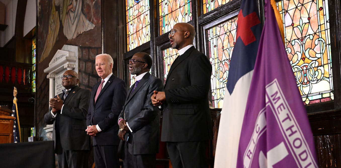 S51 S52Biden is campaigning against the Lost Cause and the 'poison' of white supremacy in South Carolina   In the blur of breaking news, one of President Joe Biden’s first speeches of the 2024 campaign was given in South Carolina and has already been mostly forgotten in the ongoing coverage of the state’s democratic primary on Feb. 3, 2024.The site of the speech on Jan. 8, 2024, was Charleston, South Carolina’s Mother Emanuel AME Church, where, on a summer evening in 2015, an avowed white supremacist murdered nine Black worshipers, including Rev. Clementa Pinckney, the church’s pastor and a state representative. At Pinckney’s funeral, then-President Barack Obama sang a heart-felt version of the Christian hymn Amazing Grace.