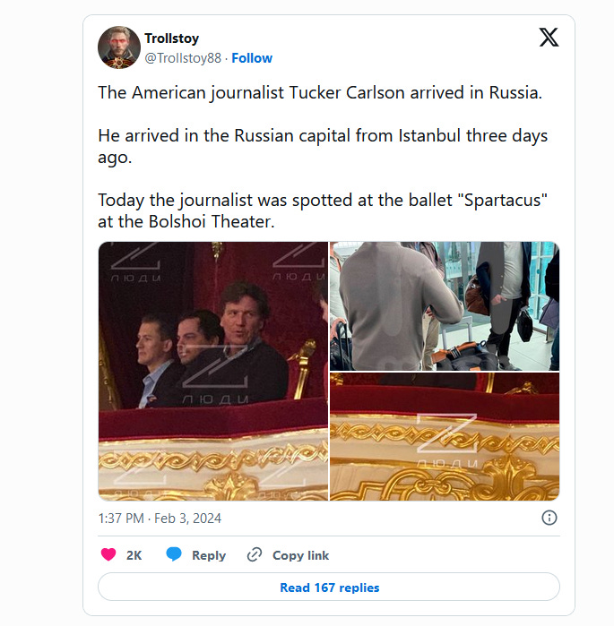 Esteemed conservative commentator Tucker Carlson was sighted enjoying a performance of "Spartacus" at the renowned Bolshoi Theater in Moscow this Saturday, triggering speculation about a potential interview with Russian President Vladimir Putin. The images capturing Carlson's presence in Russia were shared by the user TrollStoy88 on Russian X, revealing that Carlson had arrived in the country three days ago after a journey from Istanbul. Snapshots of the prominent American journalist were acquired by the Russian news agency, Mash, and subsequently shared on the network's Telegram page.