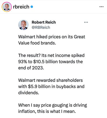 Welcome to You’re Probably Getting Screwed, a weekly newsletter and video series from J.D. Scholten and Justin Stofferahn about the Second Gilded Age and the ways economic concentration is putting politics and profits over working people. You're Probably Getting Screwed by MisclassificationAnd how labor and competition policy can help address itWelcome to You’re Probably Getting Screwed, a weekly newsletter and video series from J.D. Scholten and Justin Stofferahn about the Second Gilded Age and the ways economic concentration is putting politics and profits over working people. Last month the Department of Labor announced a new rule that will go into effect in March meant to combat worker misclassification. This is the practice of classifying employees as independent contractors and robbing workers of the rights and benefits they are entitled to. The misclassification of workers is a rampant issue that could impact anywhere between 10% and 30% of the workforce, resulting in wage losses of anywhere from $6,000 to $18,000 and is often the most prevalent in low-wage occupations. David Weil has called this the “fissuring” of the workplace, and saw how it could lead to wage theft while leading the Wage and Hour Division at the Department of Labor under President Obama. Weil wrote that the agency saw janitors, cable installers, carpenters, housekeepers, home care workers and distribution workers being denied overtime costing them three to four weeks of earnings. One form of this fissuring is the expanded use of staffing companies for ancillary functions like office cleaning and is growing to include more core functions, but the rise of Big Tech and the so-called gig economy has put misclassification on overdrive. Gig work has created an army of “small businesses” in name only. Independent contractors with none of the flexibility actual entrepreneurs enjoy, but all of the risks they face. This model has saved companies a ton of cash. For example, a study in California found that misclassification allowed Uber and Lyft to avoid paying $413 million in state unemployment insurance taxes between 2014 and 2019. A Frontline documentary about Amazon’s sprawling monopoly looked at how their use of independent contractors for delivery drivers allows them to avoid accountability for safety violations. Like the Labor Department rule, much of the work to date to address the problem of misclassification has focused on changes to labor law. New York City has a minimum wage for rideshare drivers and Seattle expanded theirs to include delivery apps like InstaCart and Grubhub. Around the country states are considering measures to make it easier for gig workers to access traditional workplace benefits while Colorado and Connecticut have proposed new protections for these workers. Beyond gig work, Kansas is dedicating additional funding for labor inspectors and Minnesota has a misclassification task force developing recommendations. However, another tool is now being considered to address this problem and that is antitrust law. Last week Alvaro Bedoya, one of five commissioners on the Federal Trade Commission, gave a speech outlining that worker misclassification is an unfair method of competition and a violation of the antitrust laws. Cory Doctorow summed up Bedoya’s argument in a must-read piece. “Misclassification is a scam that hurts workers and creates oligarchic power — and it’s also a mass-extinction event for good companies that don’t cheat their workers, because those honest companies can’t compete.” - Cory Doctorow Bedoya’s speech is not the only example of looking to antitrust law to deal with the fissuring of the workplace. Washington Attorney General Bob Ferguson used his state’s antitrust law to end the use of no-poach clauses, which are agreements among companies to not hire each other’s workers. These kinds of agreements allow franchisors to use their power over franchisees. For example a study in Rhode Island found that no-hire agreements within the fast-food labor market reduced the effective number of fast-food employers from 261 to six. What this demonstrates is that dealing with misclassification, the fissured workplace and the restraints it places on workers will require utilizing labor law and antitrust law in tandem. Antitrust enforcers are beginning to do that, but plenty of work remains. YOU’RE PROBABLY (ALSO) GETTING SCREWED BY:Shrinkflation Shrinkflation is real! Have you noticed at the grocery store corporations keeping the prices the same but you’re getting less? Here’s what it is, reasons for it and how to spot it! Walmart 1 out of 4 dollars spent on groceries is spent at Walmart. Republicans Relaxing Child Labor Laws… Judd Legum and the folks at Popular Information show how huge corporations that have claimed to be champions for Dreamers are donating large checks to Republicans pushing the great replacement theory. Drug Companies Like many other prescription drugs, the companies’ inhalers sell for hundreds of dollars in the U.S. but for only fractions of that same cost overseas. The companies charge between $200 and $600 each for inhaler products that are typically purchased monthly. 2nd Gilded Age What are We Doing for the Kids Credit Card Debt Americans now owe a collective $1.13 trillion on their credit cards, according to a new report on household debt from the Federal Reserve Bank of New York. Credit card balances increased by $50 billion, or roughly 5%, in the fourth quarter of 2023! GOOD NEWSHere’s a headline I could get used to… “Ford UAW employees get bigger profit-sharing checks for 2023 despite strike”BEFORE YOU GOBefore you go, I need two things from you: 1) if you like something, please share it on social media or the next time you have coffee with a friend. 2) Ideas, if you have any ideas for future newsletter content please comment below. Thank you. Break Em Up! Justin Stofferahn |