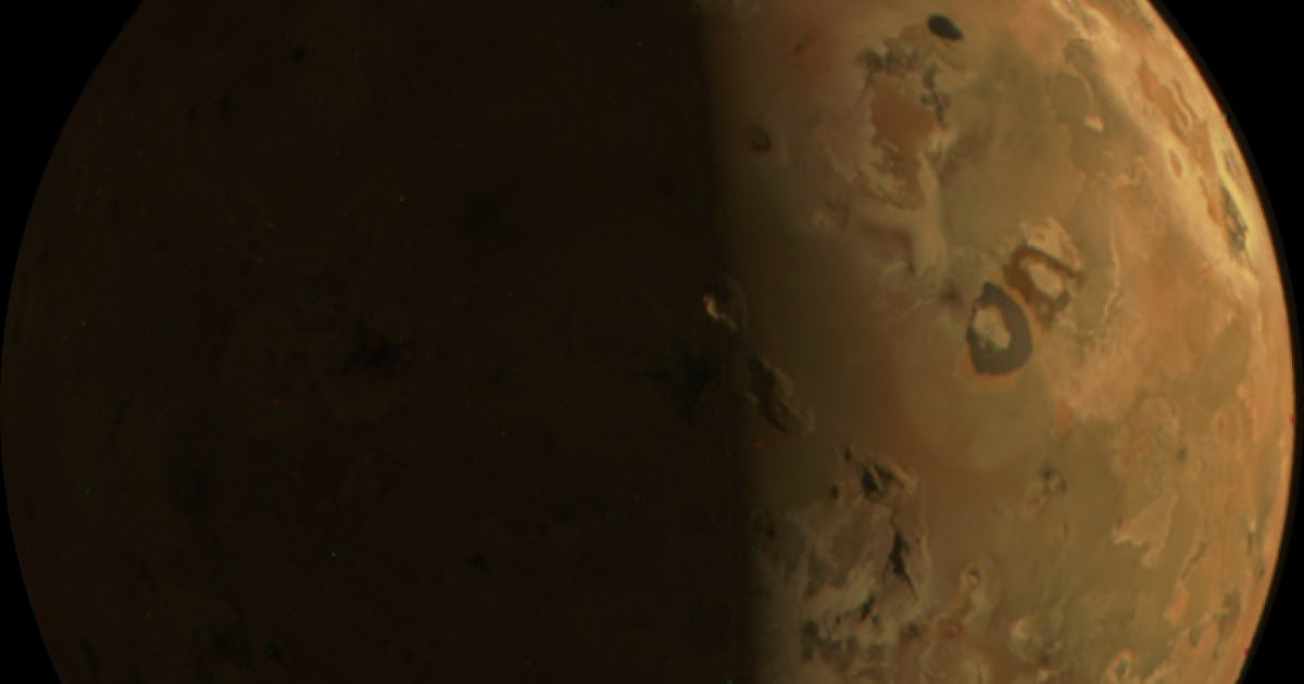S69Look! NASA Snapped A Rare Closeup of the Solar System's Most Terrifying Moon   Last weekend, NASA’s Juno spacecraft flew over the southern hemisphere of Jupiter’s moon Io. The close flyby brought Juno within 930 miles of the sulfur-shrouded hellscape of volcanoes and lava lakes that make up Io’s surface. In December 2023, the spacecraft flew over Io’s northern hemisphere and sent home striking photos. This time, Juno captured images of lava flows, volcanic eruptions, mountains, and roiling lakes of lava with islands in the middle.One of the coolest images from the February 3 flyby shows two towering volcanic plumes rising over Io’s horizon — about 2,400 miles away from the spacecraft. The pair were “emitted either by two vents from one giant volcano, or two volcanoes near each other,” writes the Southwest Research Institute on its website.