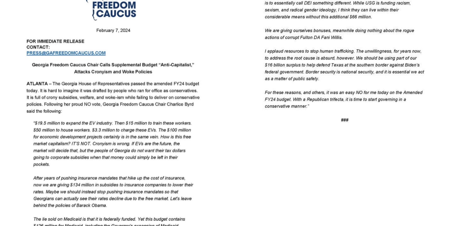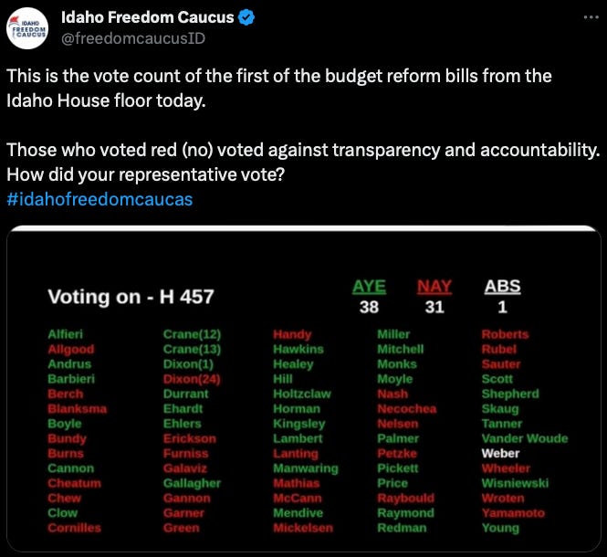 Friends, Joe Biden wasn’t the only liberal to have a bad week. The RINOs in Idaho were summarily defeated by the Idaho Freedom Caucus this week. Here’s a play-by-play of what happened: *The IDFC, along with their more conservative allies in the legislature, got a jump on the RINOs and passed strong spending reforms through their budget committee. The reforms included transparency and accountability measures that would expose $1.3 billion in “fluff” - wasteful spending that would be hard for members to defend. *Caught by surprise, the RINOs teamed up with the Democrats and their corporate special interest cronies to undo those reforms. They refused to consider the budget committee’s reforms and tried to get the budget committee to go back to the old way where they could hide their wasteful spending in large Christmas tree-type bills (they even waited until the committee’s co-chair was out sick for the day!). *While they did this, the Idaho Freedom Caucus ignited a PR war - alerting the grassroots through email, radio, and social media. *The RINOs, in a panic, got liberal Republican Governor Brad Little to oppose the budget reforms. His poor defense - reported in the press - was a word salad that made no sense. The RINOs themselves tried to confuse the public by saying the budget reforms would make Idaho more like Washington, DC. *But it was too late. The Idaho Freedom Caucus won the PR war and the first budget reform bill passed this Wednesday by a vote of 38-31 (Idaho’s House is 59R-11D). The key to this victory is that the ID Freedom Caucus laid out a bold, conservative vision, activated the grassroots, and encouraged their more conservative colleagues to join them. *Seeing the writing on the wall, the Idaho Senate voted along party lines to pass the House’s first budget reform bill. *In the aftermath of defeat, the RINOs tried to show they were still in charge so they held a vote in the Idaho House GOP caucus to “retain the majority leader”. She went down in flames. So now the Establishment is divided and demoralized. The other budget reforms bills must still pass the House (and then the Senate), but this first bill sets the stage and puts the RINOs on their heels. Needless to say, it’s no exaggeration to say that this was the biggest budget reform plan to pass in Idaho in decades! Rest assure that the Idaho Freedom Caucus will continue to wage this battle in defense of taxpayers to the very end. Georgia In the Peach State, Republicans are once again attempting to blow out spending with their FY24 budget. The details are infuriating. So-called “Republicans” are pushing to hand out massive subsidies to the electric vehicle industry, institute more mandates for health insurance, and allow woke DEI policies at Georgia’s universities. It’s a travesty, but it’s what we’ve come to expect under Gov. Brian Kemp. Luckily, the members of the Georgia Freedom Caucus called out Kemp and his RINO soldiers in the legislature. Here’s a statement from GAFC Chair, Rep. Charlice Byrd. ![]() Wyoming RINOs in Wyoming are also trying to blow out their budget for FY 2024. While families are struggling to keep up with the cost of inflation, liberal Republican Gov. Mark Gordon is asking for an increase of 12% compared to last year’s budget and is 33% higher than the budget from just five years ago. It would be the largest state budget in the history of Wyoming. Fortunately, the Wyoming Freedom Caucus is fighting back. As soon as the budget was released, they issued an op-ed. Key excerpt: “If the Governor’s budget is approved, state employees will have seen a 30% increase in total compensation from the 2020/2021 budget. How many of you have seen your total compensation packages increase 30% in the last five years?” Read the whole thing at Cowboy State Daily. Pennsylvania The Keystone State has a liberal governor. Naturally, he is proposing a budget that also blows out government spending. Gov. Josh Shapiro is proposing an 8% increase in spending (which is astonishing less than liberal Mark Gordon’s budget in “red” Wyoming). It represents an increase of over $8 billion from last year’s budget in Pennsylvania. This will inevitably lead to higher taxes and more bloated government for the citizens of Pennsylvania. Watch Pennsylvania Freedom Caucus Chairwoman Rep. Dawn Keefer’s response. As you can see, the budget fights across the country at the state level are heating up, quickly reaching to DEFCON 1. Thankfully, our state freedom caucuses are getting loud and pushing back. More to come as we wage these important battles. Keep fighting, P.S. Your help is critical in building out a network of patriots and freedom fighters throughout our nation’s state capitols and in your home state. Please consider a contribution and join us as we work to advance the cause of liberty. You're currently a free subscriber to State Freedom Caucus Network. For the full experience, upgrade your subscription. |