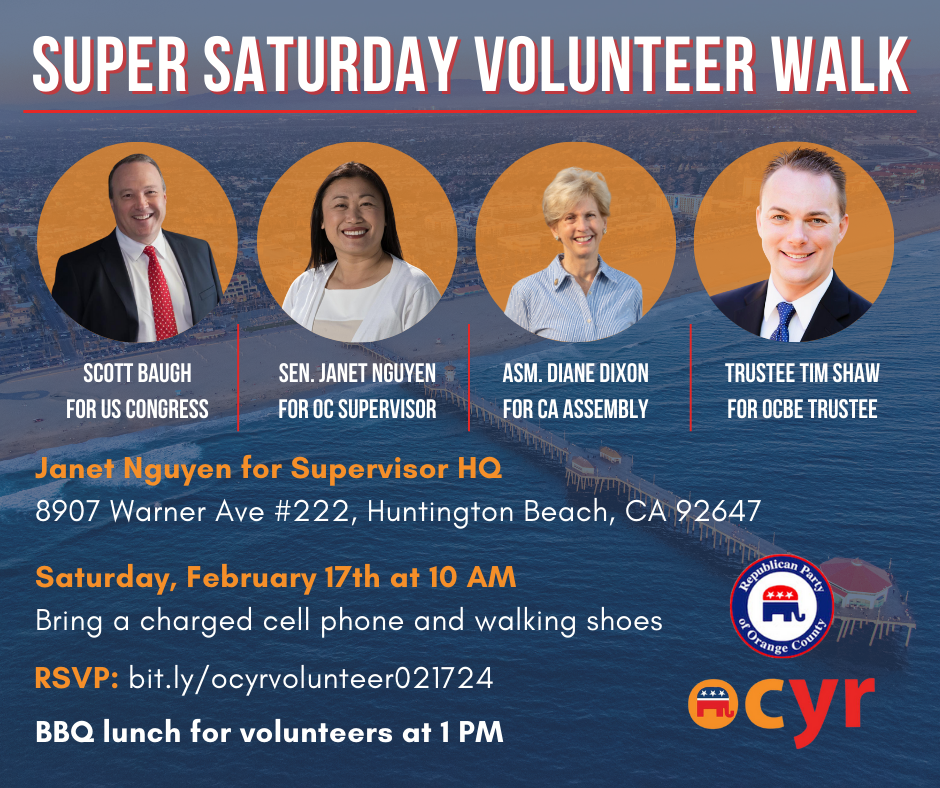 Join us this Saturday, February 17th, at 10am for our OFFICIAL OCYR Super Saturday volunteer canvass with the Orange County Republican Party and our endorsed Republican candidates!