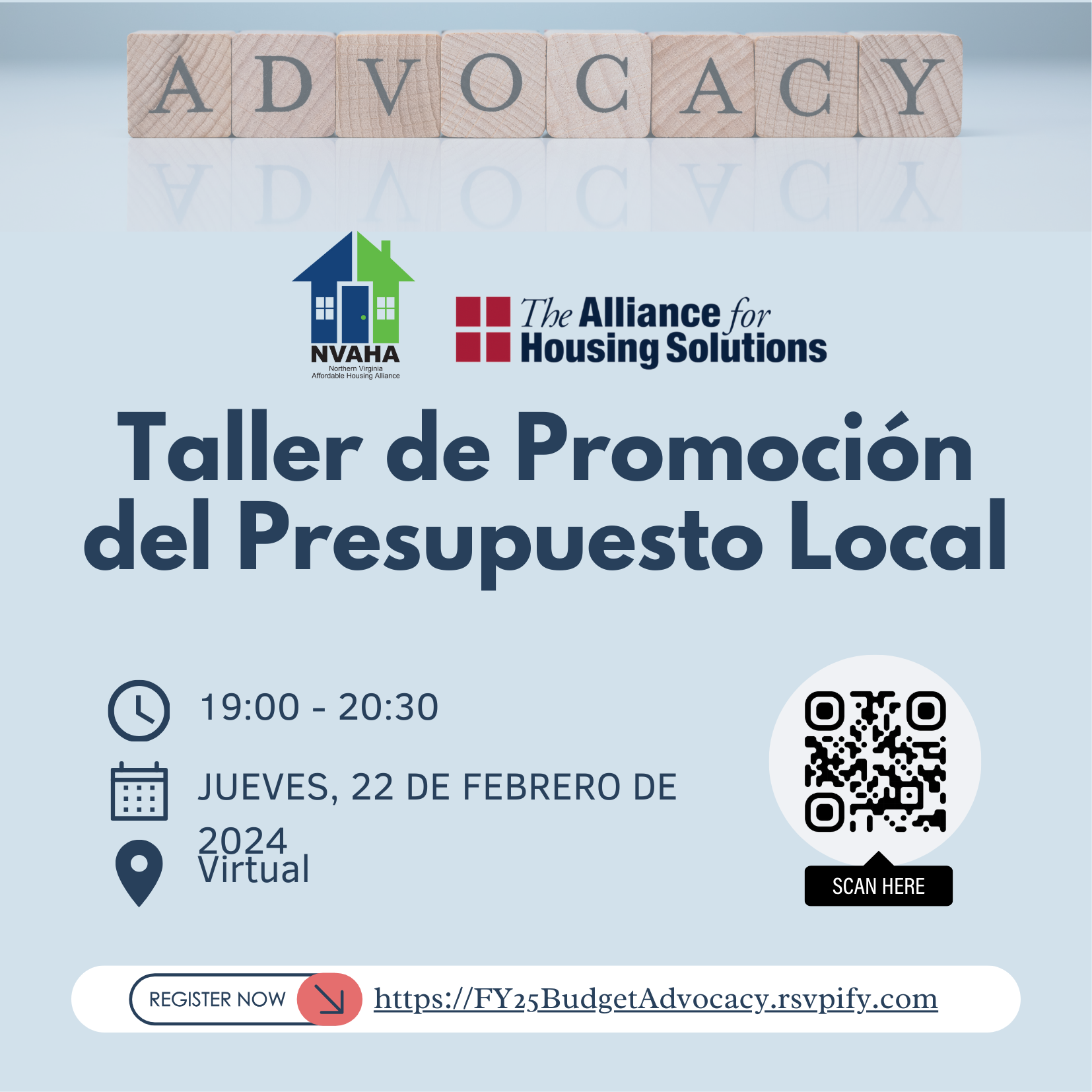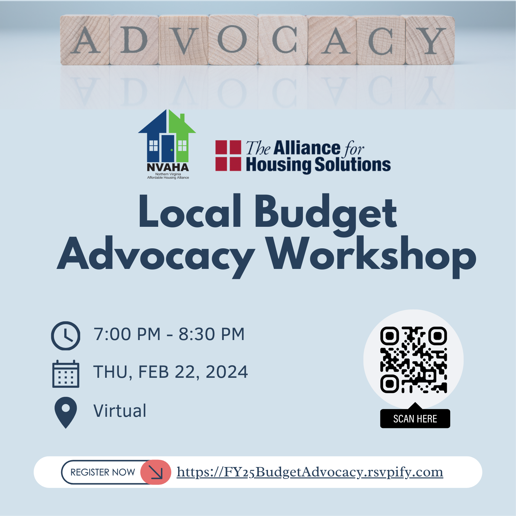 The unified Northern Virginia Affordable Housing Alliance and the Alliance for Housing Solutions are hosting a virtual Local Budget Advocacy Workshop on Thursday, February 22, 2024, from 7pm - 8:30 pm.