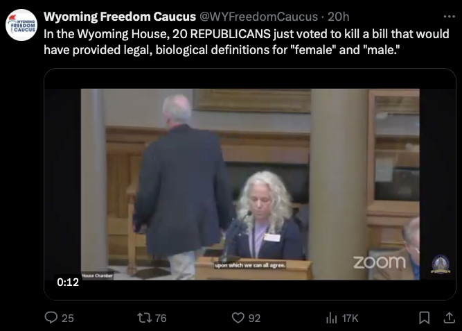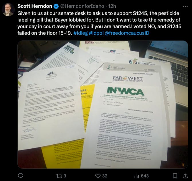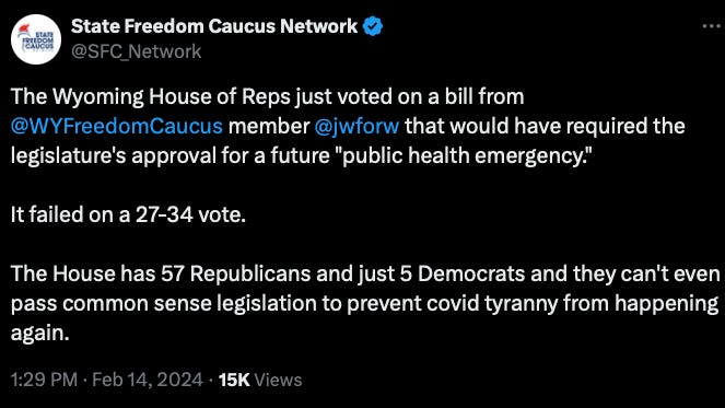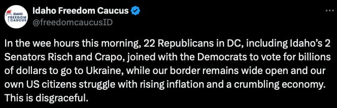 Some of the bad bills included fee increases, Orwellian restrictions on protected speech, and a fake “school choice” bill that would create a whole new government-run Pre-K program. Despite this fantastic news, there is still a LOT of work to be done to expose the liberal Republicans who control the Wyoming legislature. During this same week, a WYFC-sponsored bill to stop the COVID madness failed to pass the WY House: If that wasn’t offensive enough, these same liberal Republicans also rejected a “What is a Woman” bill, creating biological definitions for male and female, sponsored by WYFC member Rep. Jeanette Ward. Wyoming is suppose to be one of the reddest states in the country. Donald Trump won it in 2020 by a greater percentage than any other state. But Democrats and liberal Republicans in Cheyenne are rejecting common sense legislation. There is so much more work to be done to fix our states. Please help us continue to support and educate state Freedom Caucuses like Wyoming and elsewhere as they take on the Uniparty in the state capitols all across the country. IDAHO Last week, the U.S. Senate passed an unfunded $96 billion bill that sends more of our money overseas in the form of “foreign aid” instead of using that money to reduce our national debt or secure our border. Our Idaho Freedom Caucus publicly called out their US Senators who supported the deal: Also, in Idaho, special interest groups and their water-carriers in the legislature tried to push a bill through the Idaho Senate that would have granted some legal immunity to manufacturers of pesticides like Bayer’s Round-Up. Democrats - in a brief moment of sanity - opposed the bill along with the Idaho Freedom Caucus and allied conservative lawmakers. In the end, they defeated the bill! Unlike their Big Pharma colleagues who helped shove immunity protection through Congress on the COVID vaccines, Bayer simply couldn’t buy off enough votes to get this passed. Big win against crony capitalism! Here’s a tweet from IDFC member Sen. Scott Herndon, who was heavily lobbied by Big Ag: Keep fighting, P.S. Your help is critical in building out a network of patriots and freedom fighters throughout our nation’s state capitols and in your home state. Please consider a contribution and join us as we work to advance the cause of liberty. You're currently a free subscriber to State Freedom Caucus Network. For the full experience, upgrade your subscription. |