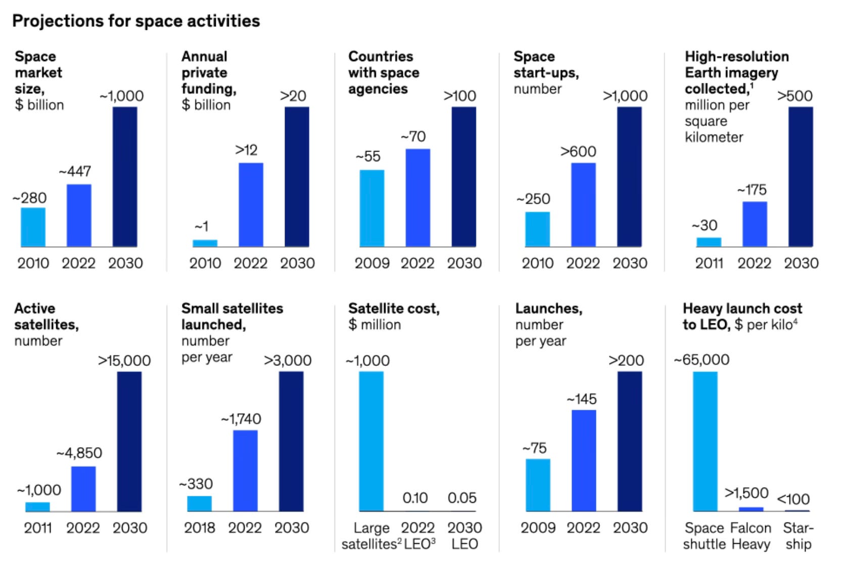 For those interested in keeping tabs on Odysseus this week, please visit the real time mission update page on Intuitive Machine’s website. A successful landing on the moon would be, I believe, a watershed moment in the space industry that very well might be the space industry’s version of the Internet’s 1994 release of the Netscape Navigator. For those old enough to remember, Marc Andreessen’s commercial browser was the first to offer an easy-to-use interface that enabled users to access the World Wide Web without having to be computer-savvy. It was an immediate blockbuster success that led to an eye-popping IPO for Netscape, and spurred an explosion of investment and innovation in commercial activity on the internet. Bloomberg Originals launched a docu-series in 2019 called Giant Leap that focuses on the business of space: “In the not-too-distant future, entirely new industries will be developed in space. These are the stories about the entrepreneurs and visionaries who are taking that next Giant Leap.” (emphasis added) The first episode, aired in October 2019, was titled “Space: The Final Business Frontier.” In it, Carissa Bryce Christensen, Founder and CEO of Bryce Space and Technology, notes that “There is a $200+ billion commercial space industry right now today” and over the last four years the business has boomed. By 2022, Fortune estimated the commercial space industry had grown to more than $425 billion, and McKinsey is projecting that it could grow to $1 trillion by 2030. I believe we are at an inflection point in the space industry and the next five years will see a massive acceleration in the number of new businesses and business models in the space economy. Consider the following chart from a 2023 McKinsey comment titled “A Giant Leap for the Space Industry,” which might (in my opinion) actually be underestimating the industry’s potential growth. While it’s impossible to list out every opportunity that will emerge for entrepreneurs in space, there are five emerging commercial space segments that illustrate the vast potential for business innovation in space: space transport, satellite communications, space manufacturing, space mining, and space tourism. Space Transportation ServicesThe remarkable success of SpaceX has demonstrated that the commercial launch industry is open for business. The lower right chart in the graphic above tells the story of what private enterprise has achieved. Launch costs per kilogram have plunged, enabling greater access to space for entrepreneurs looking to create space-based businesses. Just as the fall in data transmission prices increased consumer access to the World Wide Web and enabled entrepreneurs to start new internet businesses, so too have plunging launch costs enabled greater access to space for startups working on new space businesses. It’s also worth noting that the launch industry itself is not done innovating. Large launch companies like SpaceX are offering low-cost transportation services between earth and a specific destination in space (usually determined by the largest customer on the rocket). The table below looks at a handful of the leading space transportation companies that are working to develop low-cost, reliable, and safe access to space for humans and payloads. Private Companies Providing Launch Services