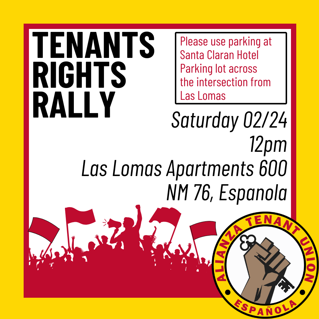 Friends and Comrades- We have an important week coming up: A rally for Alianza Tenant Union, a busy General Meeting, and continuing support for a ceasefire in Gaza. We feel great pride to see so many fellow New Mexicans showing up for so many worthy causes!