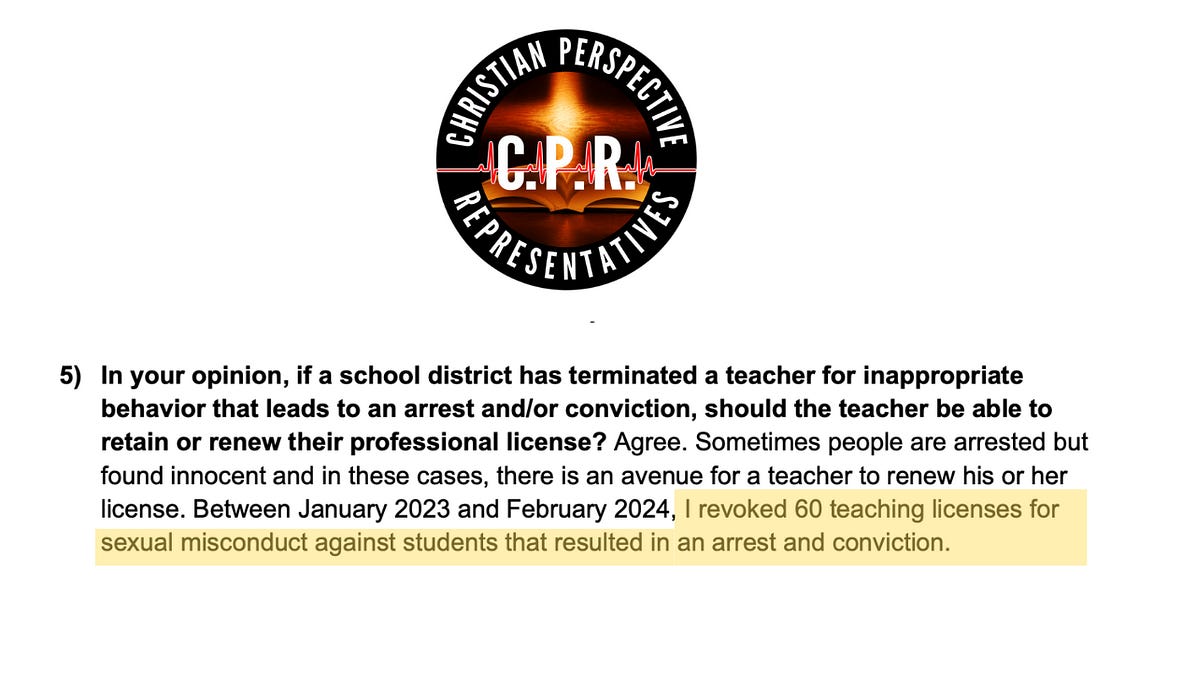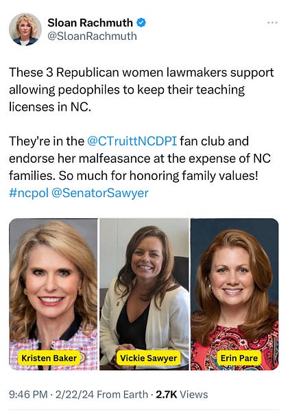 NC Superintendent Defends Failing System That Allows Convicted Pedophiles To Keep CredentialsFormer teachers convicted of sexually abusing children are still licensed to teach in North Carolina. Both the Superintendent and a Republican Representative ignore the problem's severity.Protecting schoolchildren from pedophiles should be a priority in North Carolina. We expect elected officials to ensure teachers convicted of abusing children are banned from teaching in the future. Catherine Truitt has been criticized for her lapses in policing predatory teachers. As Superintendent, Truitt failed to revoke teachers' teaching licenses after being charged with sex abuse last year. This is according to members of the Onslow and Lee county boards of education. Onslow County officials say they promptly notified DPI when a teacher was fired and surrendered his license voluntarily after he was arrested for secretly filming children undressing. Yet Truitt’s team did not record a revocation in its database as required by law. Several Republican legislators intervened last March to force Truitt to suspend the license of convicted pedophile Jeremy Flock from Cabarrus County. Perhaps this is why the incumbent candidate proudly promotes a record of personally revoking teaching licenses of those accused or convicted of inappropriate behavior or child sex offenses. See Truitt's answer to a related question in the Christian Perspectives Voter Guide: In her answer, Truitt omits the fact that at least 3 former teachers are still licensed to teach after being convicted of heinous crimes against children. ![]() Convicted Former Teachers With Actice NC Livenses The teacher disciplinary system is a complete mess, but Truitt claims credit for it. Erin Pare,' NC House Rep. from Wake County, maintains that the Protect Our Students Act prevents convicted teachers from keeping their licenses. The bill does increase the penalties for teachers who are arrested for sex crimes against students. However, it will do nothing to tighten the lax discipline system in place at the state level - the system Catherine Truitt takes credit for. Pare' who serves as Catherine Truitt's campaign surrogate, took to a Charlotte radio show last night to rail against those, like me, who are exposing Truitt for these egregious lapses in child safety. Pare’ took exception to this X post I published last week: For Pare, the real villains were those who pointed out these systemic dangers, not the pedophiles who could keep their teaching licenses. But it’s time for lawmakers to stop gaslighting and passing the buck. North Carolina needs to act now to ensure that all loopholes are closed so abusers no longer have access to the classrooms. All convicted teachers must be removed from the teaching profession and banned from teaching in the state. We must pass legislation requiring background checks for all school staff in public and charter schools. Sloan’s Substack is free. |