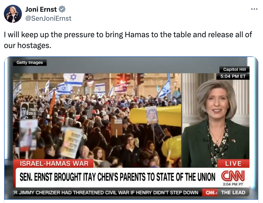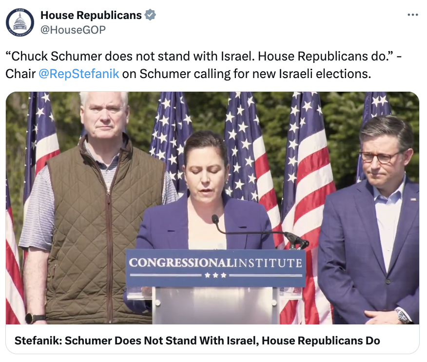 "Instead of meddling in elections of a sovereign nation, Chuck Schumer should follow House Republicans' lead in supporting our ally in their darkest hour. The obstacle to peace is Democrat leader Chuck Schumer who has refused to pass the Israel aid package that supports our ally Israel as they fight Iranian-backed Hamas terrorists."