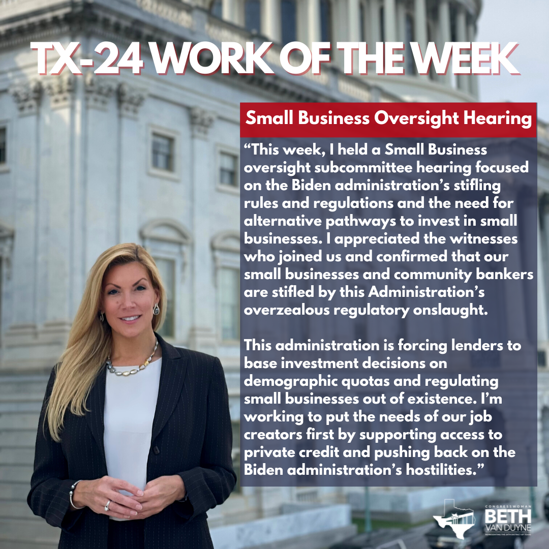 Then, I held a Small Business Oversight Subcommittee hearing to highlight how overregulation is preventing small businesses from accessing capital. I was glad to learn more about how our job creators utilize private financing to find success despite the Biden administration's destructive regulatory environment. You can watch my opening remarks by clicking on the photo below or read more about this hearing in the Work of the Week section. | |