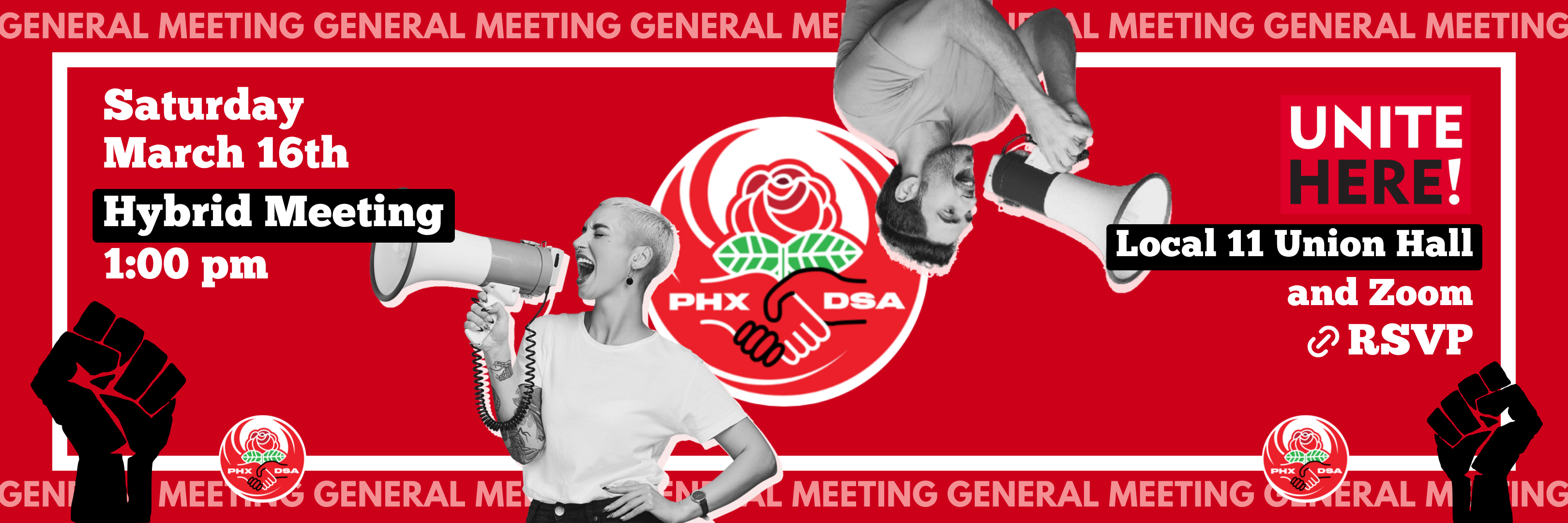 Join us TOMORROW (March 16, 2024) at Unite Here! local 11’s union hall to meet comrades, discuss business, and join actions at Phoenix DSA’s March chapter meeting. In-person and virtual attendance options are available.