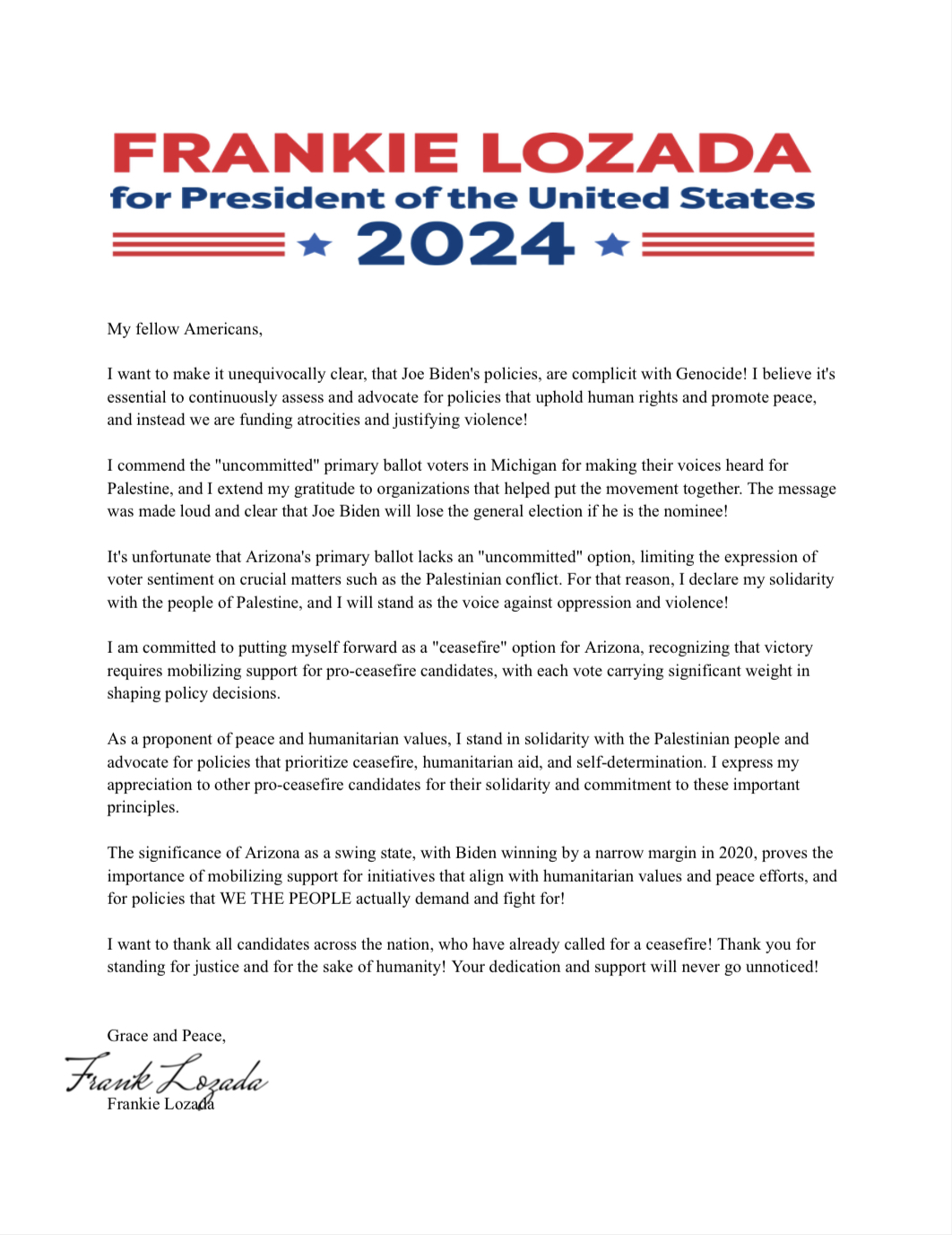 In anticipation of this moment, Phoenix DSA leadership has encouraged Presidential candidates to write a letter explaining their support for Palestine and their willingness to serve as AZ’s “uncommitted” option. Two such candidates responded: Frankie Lozada and Gabriel Cornejo. Their letters to Arizona are included below.