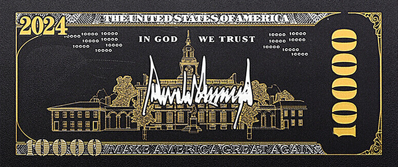 Along with the customary "IN GOD WE TRUST" words, and of course Donald Trump's famous signature!