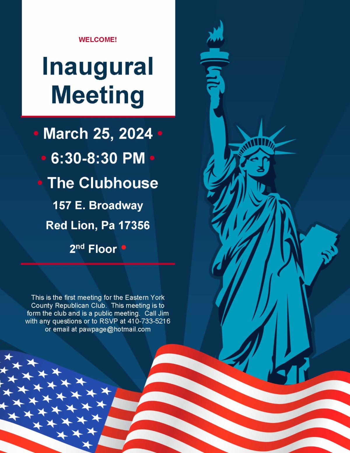 The Eastern York County Republican Club will be debuting on March 25; 6:30-8:00 (doors will open at 6:00) at the Red Lion Clubhouse (157 E Broadway Red Lion). We will be discussing the current and future organization of this club, current candidates, and election integrity. These are important topics, but this will not be just a club of gathering information--that is step #1. We will be taking the information and using it to make a plan of action. Things don't get done when we sit on the couch.