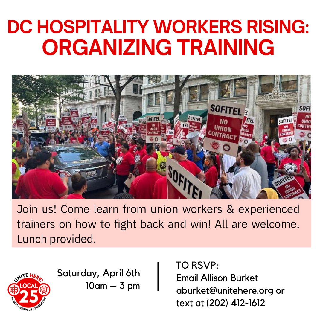 On Saturday, April 6 from 10 AM-3 PM, join UNITE HERE Local 25 to learn from union workers and experienced trainers how to fight back and win. All are welcome, and lunch will be provided. RSVP using this form. You can also email Allison Burket or send a text message to (202) 412-1612.