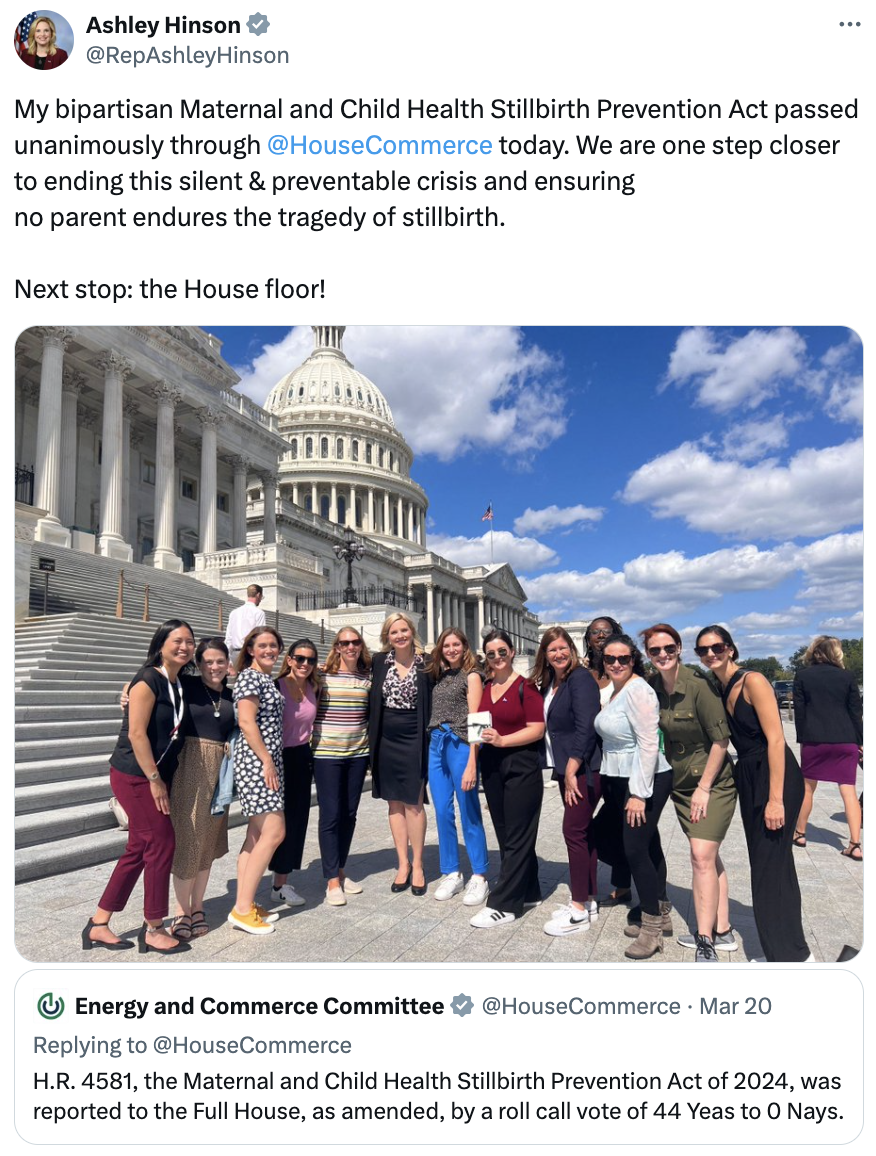 Rep. Ashley Hinson (IA-02) announced that legislation she authored unanimously passed the House Commerce Committee. According to Hinson's office, "One out of 75 U.S. births tragically result in stillbirth, accounting for nearly 21,000 stillbirths a year — more stillbirths annually than the number of babies who pass during the first year of life."