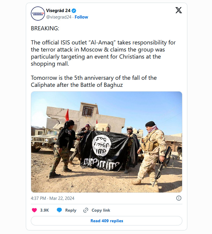 ISIS has officially claimed responsibility for the brutal terror attack on Crocus City Hall in Moscow, marking a dark moment in the city’s history. The assault, which unfolded on Friday evening, has resulted in over at least 40 fatalities and left more than 100 people injured. The meticulously coordinated attack saw armed assailants storming the Crocus City Hall concert venue, where they unleashed a barrage of gunfire and detonated explosives, igniting a fire that rapidly engulfed the building. Harrowing video footage circulating across media platforms showed the ensuing inferno and the massive plume of smoke that towered over the scene. Russian state media, including outlets such as TASS and RIA Novosti, have reported that the assailants, dressed in camouflage, forced their entry into the venue and initiated the attack with automatic weapons. The chaos that followed the initial gunfire and the explosion of what appeared to be a grenade or incendiary device has been described as a scene of absolute pandemonium. Despite the best efforts of firefighters and rescue personnel, the full extent of casualties remains uncertain. In the aftermath of the attack, the Russian government has issued a stern condemnation, describing the act as a “monstrous crime.” Moscow’s authorities have taken immediate steps to enhance public safety, including the cancellation of all mass gatherings and the reinforcement of security measures across significant transport hubs. The ISIS-affiliated media outlet Al-Amaq stated that the attack specifically targeted a Christian event at the shopping mall, marking the attack as a deliberate act of terror. The claim comes as the world commemorates the 5th anniversary of the fall of ISIS’s so-called Caliphate, following the Battle of Baghuz. President Vladimir Putin has yet to issue a public statement regarding the tragedy. However, the U.S. had previously warned of potential extremist attacks targeting concerts, a chilling premonition that has now been realized with the attack on Crocus City Hall—a venue notably associated with the Miss Universe pageant hosted by Trump in 2013. Moscow Mayor Sergei Sobyanin has expressed his condolences to the victims’ families, pledging to provide all necessary assistance to those affected by the incident. On March 7, the U.S. cautioned that “extremists” might target concerts or other large events in Moscow, a warning that was connected to the attack that occurred on Friday. American officials clarified that the alert was not about potential Ukrainian sabotage. They also mentioned that the State Department would not have described actions potentially originating from Kyiv using the term “extremists.” This is a developing story… ![]() Continue reading this post for free, courtesy of PatriotNewsToday.A subscription gets you:
