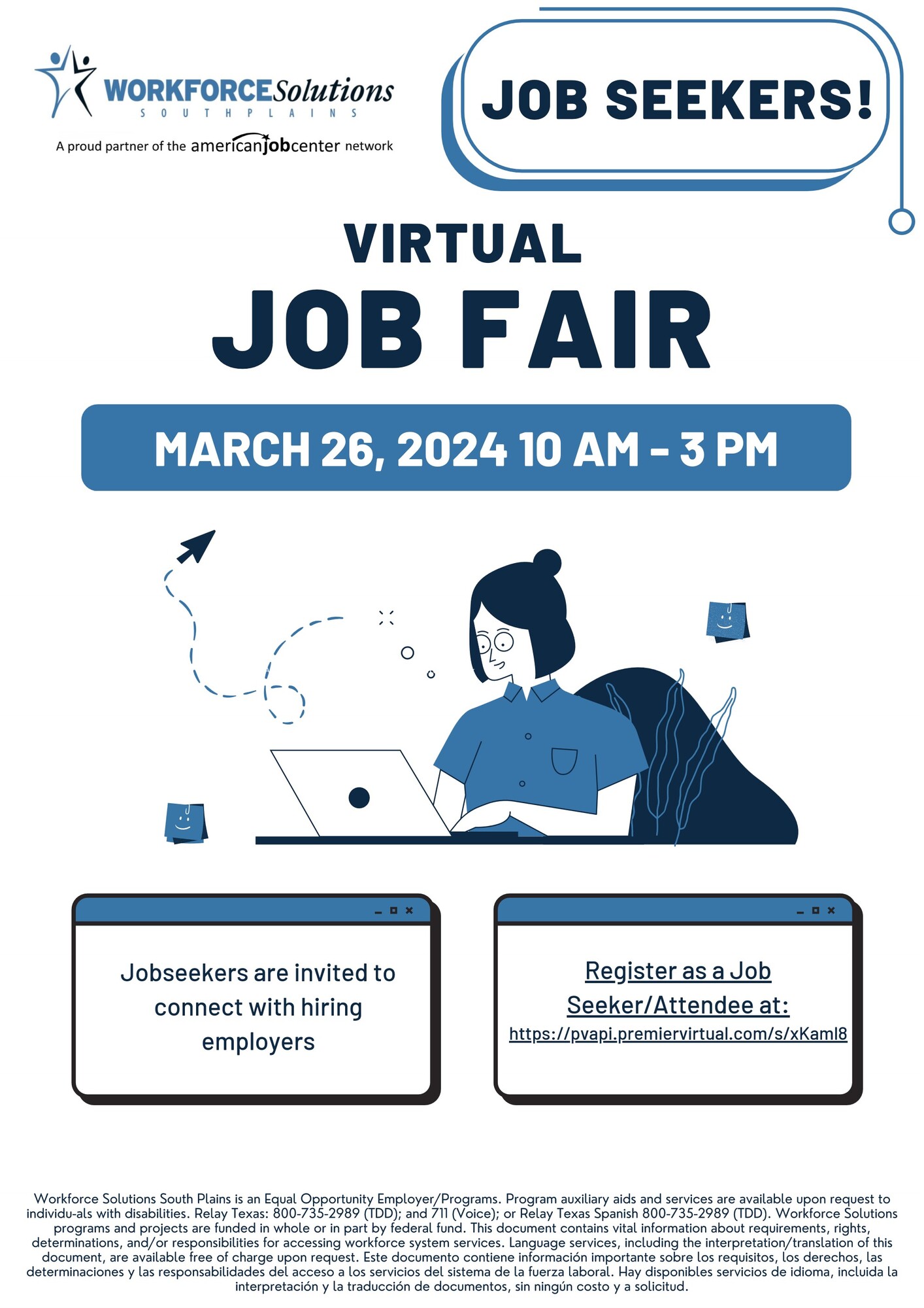 Dear Job Seeker/Unemployment Benefits Claimant:? ? ? Are you a job seeker in the South Plains who is currently looking for a new career? You are invited to participate in the free Virtual Job Fair hosted by Workforce Solutions South Plains scheduled for Tuesday, March 26th, 2024 from 10am ? 3pm!? Register online by opening and following the instructions provided in the link below. We look forward to building new connections!! ? Click to register: https://pvapi.premiervirtual.com/s/xKaml8 If you have questions please call 1 866 765-5038 and speak to a career counselor. ? Thank you!??