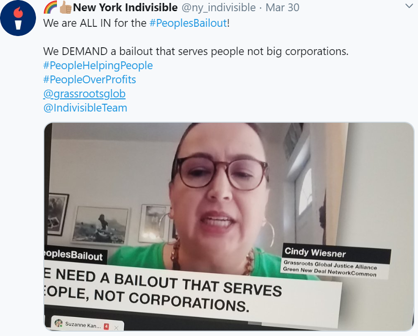 - Email your representative and two senators and demand they prioritize a People’s Bailout. Use our tool to send a letter to your three members of Congress, which outlines what a People’s Bailout would include.