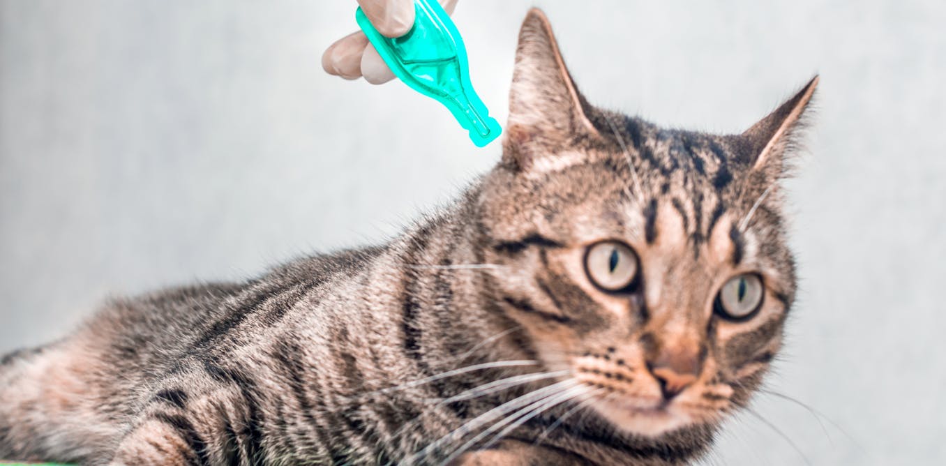 S48 S49Pet flea and tick treatments contain pesticides that end up washing into the environment - here's how   Spot-on parasiticides are liquids applied to the back of the pet’s neck. They spread over the skin of the animal making it toxic to fleas (and sometimes ticks) for at least one month. They’re often sold as part of a pet healthcare plan, whereby pet owners make a monthly payment for a package of year-round treatments. Around [86% of dogs and 91% of cats] are treated for fleas at least once a year, whether fleas are present or not. The most common active ingredients in these treatments are called imidacloprid (an insecticide linked to bee declines) and fipronil, another potent insecticide that can harm the nervous systems of animals and humans.