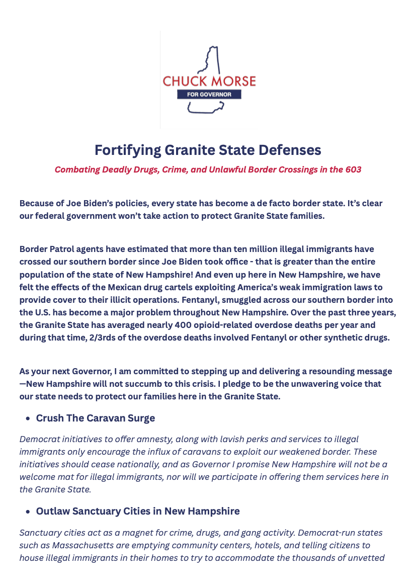 I am thrilled to share a pivotal moment from our campaign journey, one that underscores my commitment to ensuring the safety and prosperity of our cherished Granite State. Today, alongside esteemed leaders from both the State Senate and House, I unveiled a comprehensive plan designed to tackle the urgent issues of deadly drugs, crime, and unlawful border crossings facing our communities.