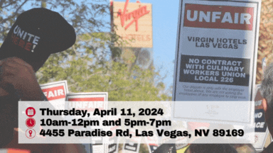 There is still one casino left! Workers at Virgin Hotels Las Vegas are still negotiating to win the BEST wage & benefit increases, a reduction in workload and housekeeping credits, improved safety protections, and so that ONE JOB IS ENOUGH to provide for their families.