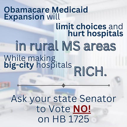 There are alternative approaches to addressing the needs of citizens living in rural areas and those who are uninsured, rather than expanding Medicaid. I addressed this issue in my article about repealing Certificate of Need Laws. Read all of Dana’s post and stay informed about politics in Mississippi |