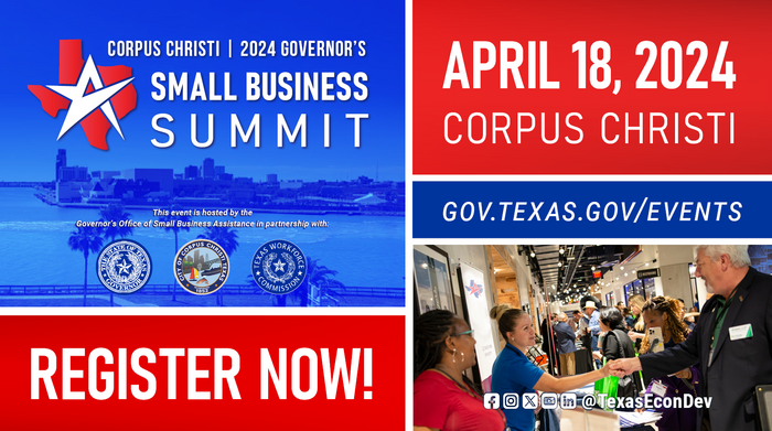 About: The Governor's Small Business Summit — Corpus Christi aims to help Texas small business owners and aspiring entrepreneurs reach new heights by connecting them with the resources and information needed to start, strengthen and grow a business. This event offers a variety of sessions bringing together local, state and federal resource partners to provide key insights on critical business topics. It's also an opportunity to network with other business owners and meet experts who will share timely, relevant and actionable advice on a multitude of small business subjects.