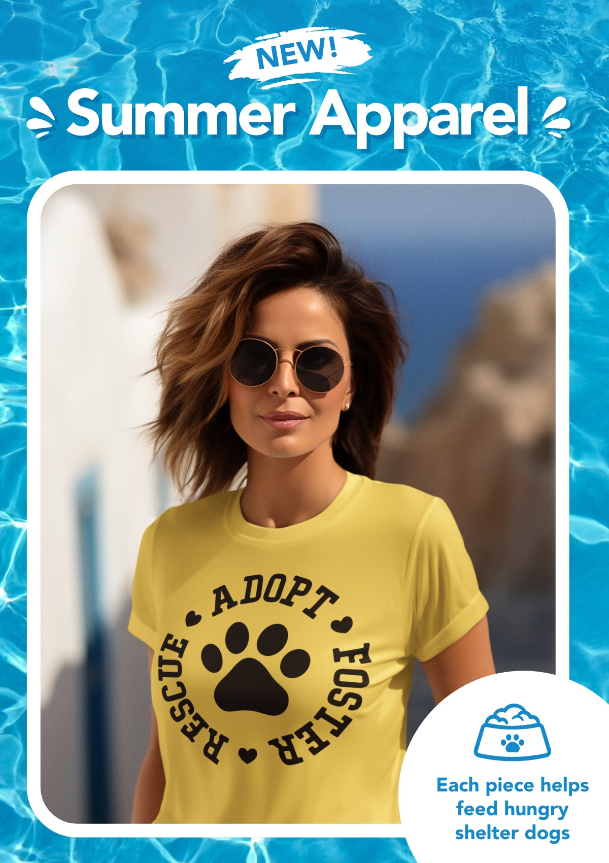 Summer's here, and our new apparel collection is perfect for soaking up the sun. Each piece you grab helps feed hungry shelter dogs, making a difference with every purchase.