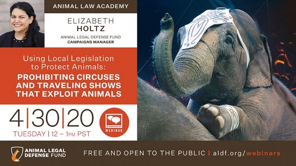 Please join Elizabeth Holtz, Animal Legal Defense Fund's Campaigns Manager for Using Local Legislation to Protect Animals: Prohibiting Circuses and Traveling Shows that Exploit Animals, a webinar walking you through the steps to pass a ban, as well as sharing tips that can be applied to any local legislative campaign.