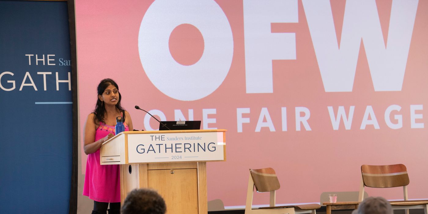 One Fair Wage co-founder and president Saru Jayaraman during a speech at The Gathering. (Photo: Will Allen 2024 / via the Sanders Institute)