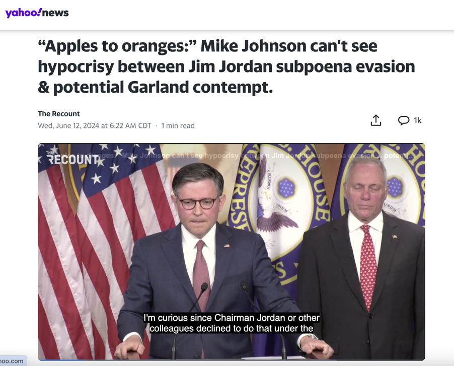 Speaker Mike Johnson also can't be bothered with Jordan's above-the-law mentality. If you've ever read the book 1984 by George Orwell, you'll recognize the following statement by Johnson—that Jim Jordan evading a congressional subpoena for over 766 days is ok while Attorney General Garland should be held in contempt for the same thing—as a classic example of doublethink: