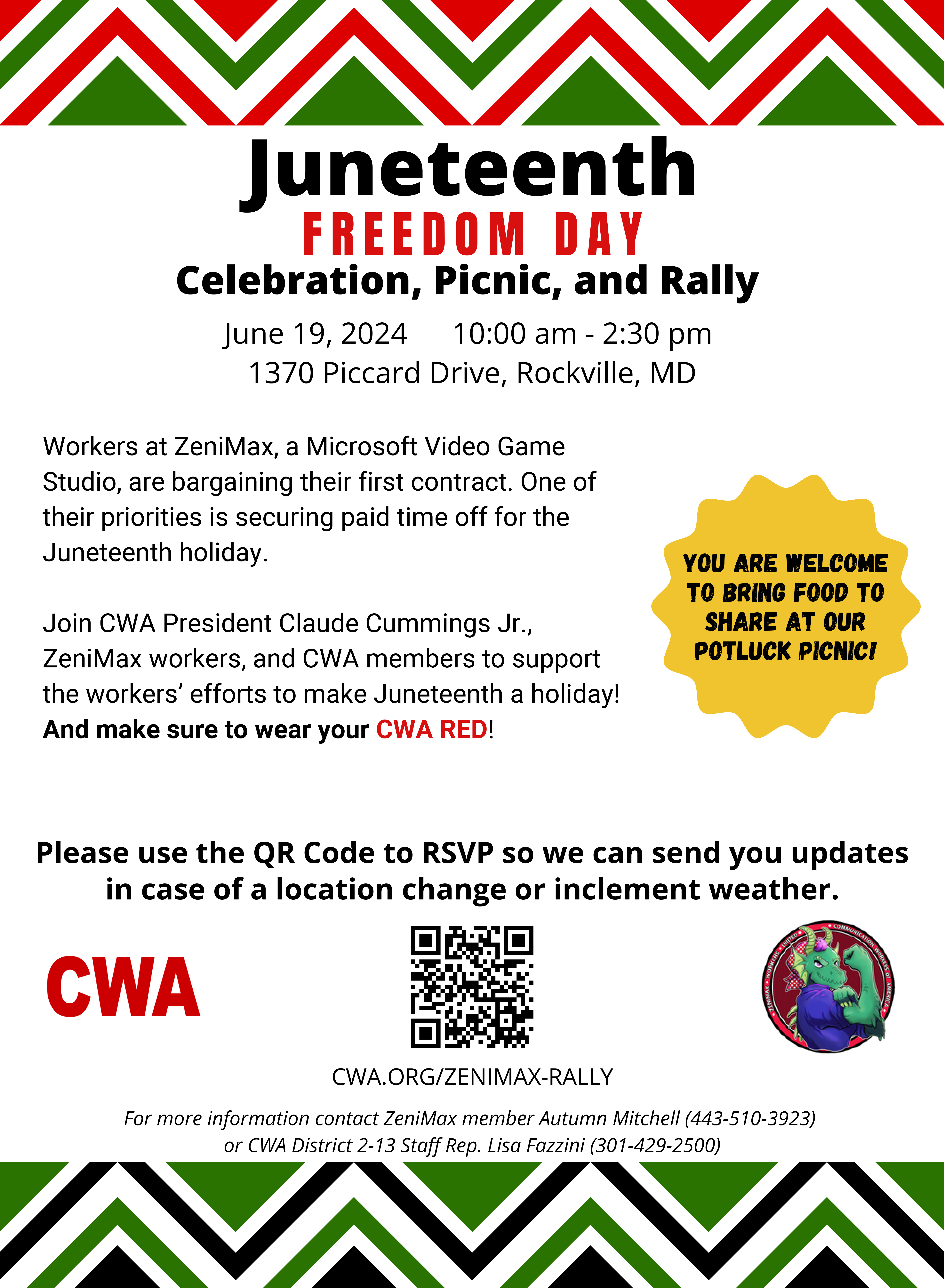 TODAY at 10 AM, join CWA-ZeniMax Workers United and Communications Workers of America President Claude Cummings Jr. for a Juneteenth Celebration, Picnic, and Rally in Rockville, MD. RSVP to today's rally »