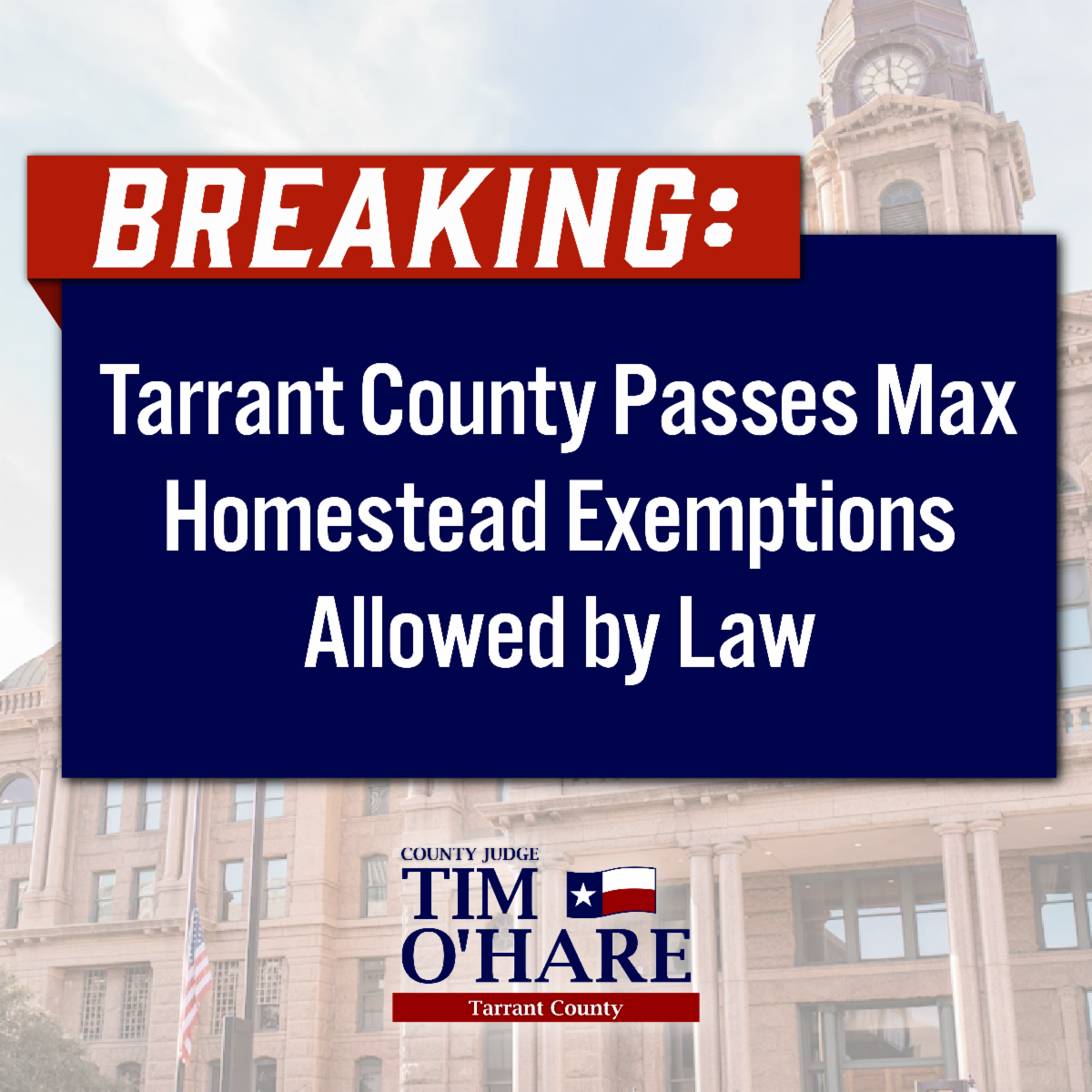 Last year, we put in place 10% homestead exemptions for the County and Hospital District for the first time ever. As of yesterday afternoon, Tarrant County has now adopted the maximum Homestead Exemptions allowed by state law for both the County and Hospital District - 20% for each. Setting both Homestead Exemptions at 20% for the first time in Tarrant County is not only historic, it's common sense responsible government.