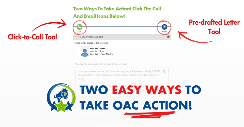 For over a decade, OAC has championed the Treat and Reduce Obesity Act (TROA), a bipartisan bill designed to provide Medicare beneficiaries with access to safe, effective, and life-saving obesity treatments. Today, we stand at a pivotal moment in our mission to improve healthcare for millions of Americans. With less than six months left in the current congressional session, your support is more important than ever. By urging Congress to support the coverage of obesity medications under Medicare Part D and expand the availability of IBT providers, we can ensure that all individuals affected by obesity receive the comprehensive care they deserve. Your voice matters, so we've updated our advocacy tool with a brand-new way to take action -- a click-to-call feature. Phone calls, in addition to letters, make our advocacy even more impactful. But don't worry, we've made it easy for you! Simply enter your name, email and address, and we will automatically connect you to your Congress member and provide a sample script. |