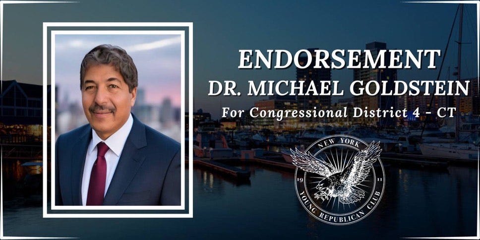 Goldstein For Congress - Please Subscribe and also visit us at www.goldsteinforcongress.com ENDORSEMENT: New York Young Republican Club Endorses Dr. Michael Goldstein for CongressGrateful for the SupportThe New York Young Republican Club is proud to endorse Dr. Michael Goldstein for Connecticut’s Fourth Congressional District. With his plethora of experience fighting for the American people over a period of decades, Dr. Goldstein has shown the tenacity, credentials, perseverance, and conservative principles required to be a powerful, honorable, and selfless representative for the people of Connecticut. Dr. Goldstein is a Board-Certified Physician of over forty years. He served as the President of the New York County Medical Society for two terms and still serves as a Board Member. For over four decades, Dr. Goldstein has been on the front lines of the medical industry, fighting for his patients and saving thousands of lives. Beyond his medical experience, Dr. Goldstein has worked numerous blue-collar jobs, is also a lawyer, and currently serves as an elected City Councilman at the Greenwich Representative Town Meeting. He has published numerous articles in health law journals and is a strong proponent of healthcare reform that puts Americans and their healthcare needs first. Dr. Goldstein has made it very clear that the American people and their healthcare needs are at the crux of his medical and legal training and his extensive grassroots activism. A great example is that, as an active member of the Board of Managers of the SUNY Downstate College of Medicine Alumni Association, Dr. Goldstein has worked to give scholarships and grants to economically-disadvantaged medical students, easing their financial burdens and providing them the opportunity to fulfill their dreams. The New York Young Republican Club strongly believes that Dr. Goldstein will leverage his vast experience in the healthcare activism field to fight the Radical Left’s agenda in Congress. His common-sense, America-First approach will focus on shrinking government, fighting corruption at the core of our institutions, reducing healthcare costs and administrative burdens, protecting our freedoms, championing pro-American healthcare legislation, empowering small business growth, and eradicating anti-semitism. Dr. Goldstein recently received the endorsement of the Medical Society of the State of New York (MSSNY). This is the first time in recent history that the MSSNY has endorsed a candidate that is not an incumbent, and the MSSNY stated that “physicians need more physicians in Congress to represent their interests.” As we approach the most pivotal election in recent memory, we recognize that Connecticut, just like every state in this country, requires strong Republican, conservative, America-First candidates who are prepared to protect the American people from the Left’s years-long plan to destroy this country. The New York Young Republican Club believes Dr. Goldstein is one such candidate well-equipped to put the state of Connecticut back on track, and encourages all registered Republicans to vote for Dr. Michael Goldstein in Connecticut’s primary on August 13th. Please note that Early Voting will take place August 5th through August 11th. Please visit my website www.goldsteinforcongress.com for more information Michael’s Substack is free today. But if you enjoyed this post, you can tell Michael’s Substack that their writing is valuable by pledging a future subscription. You won't be charged unless they enable payments. |