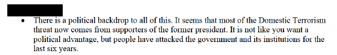The group went on to discuss how “most of the Domestic Terrorism threat now comes from supporters of the former president,” i.e., Trump supporters.