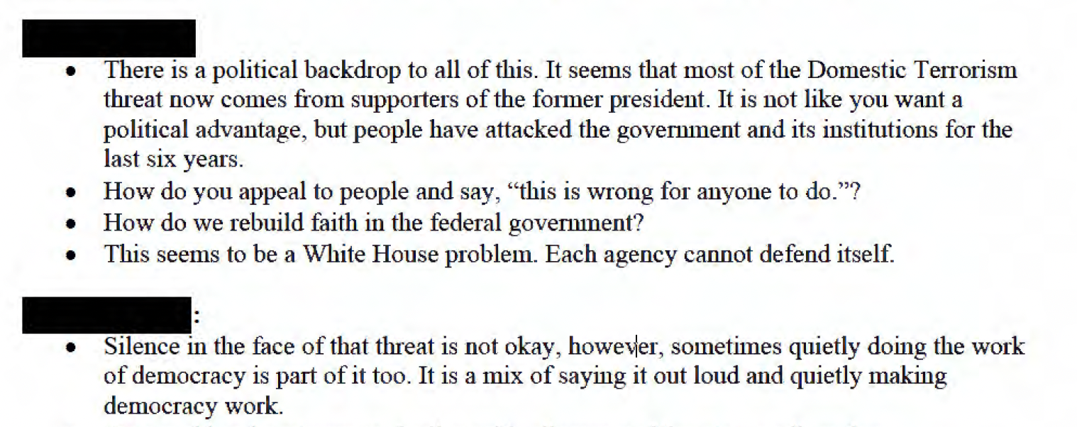 Against the backdrop of claiming that Domestic Terrorism only comes from supporters of former President Trump, the Group revealed the existence and mindset of the Deep State, which "quietly mak[es] democracy work" to achieve their mission of combatting the "domestic terror threat" of Trump supporters in order to “rebuild faith in the federal government.”