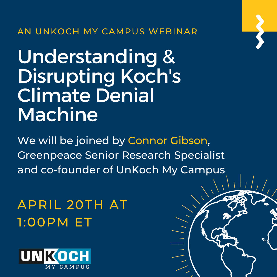 Connor Gibson, Senior Researcher at Greenpeace USA will be our guest speaker for this call. The webinar will close with UnKoch My Campus announcing our newest campaign to #DitchDenialDollars to combat climate misinformation. Our campaign will go live on Earth Day, and webinar attendees will be the first to learn how to take action! Register now or click on the image below! | |